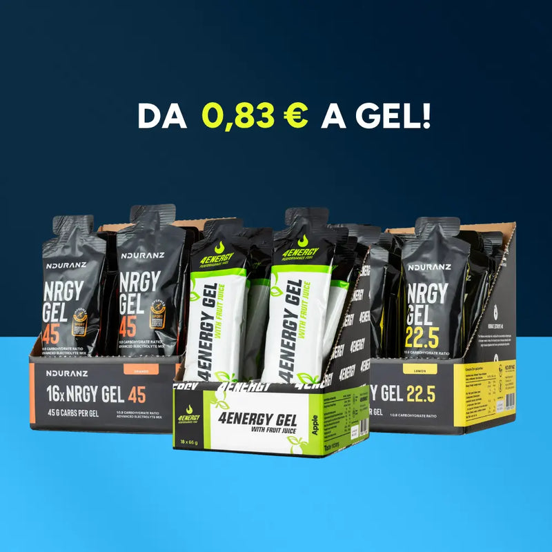 Fai il pieno di energia con gel a rapido assorbimento, leggeri sullo stomaco, pensati per chi pratica sport di lunga durata.